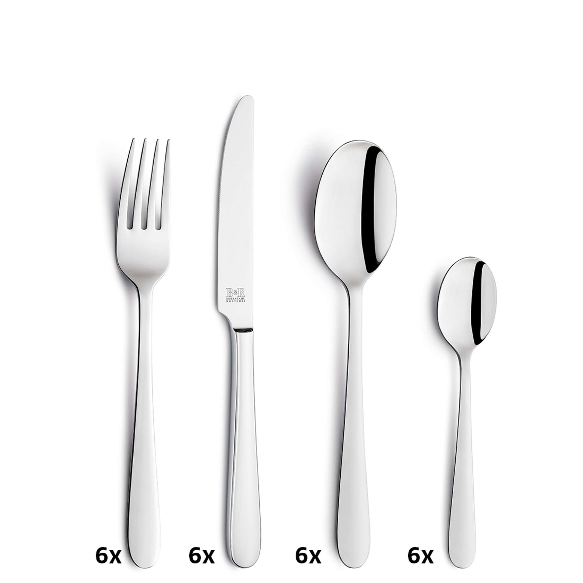 • Contents: 6 coffee spoons, 6 dinner forks, 6 dinner spoons, 6 dinner knives