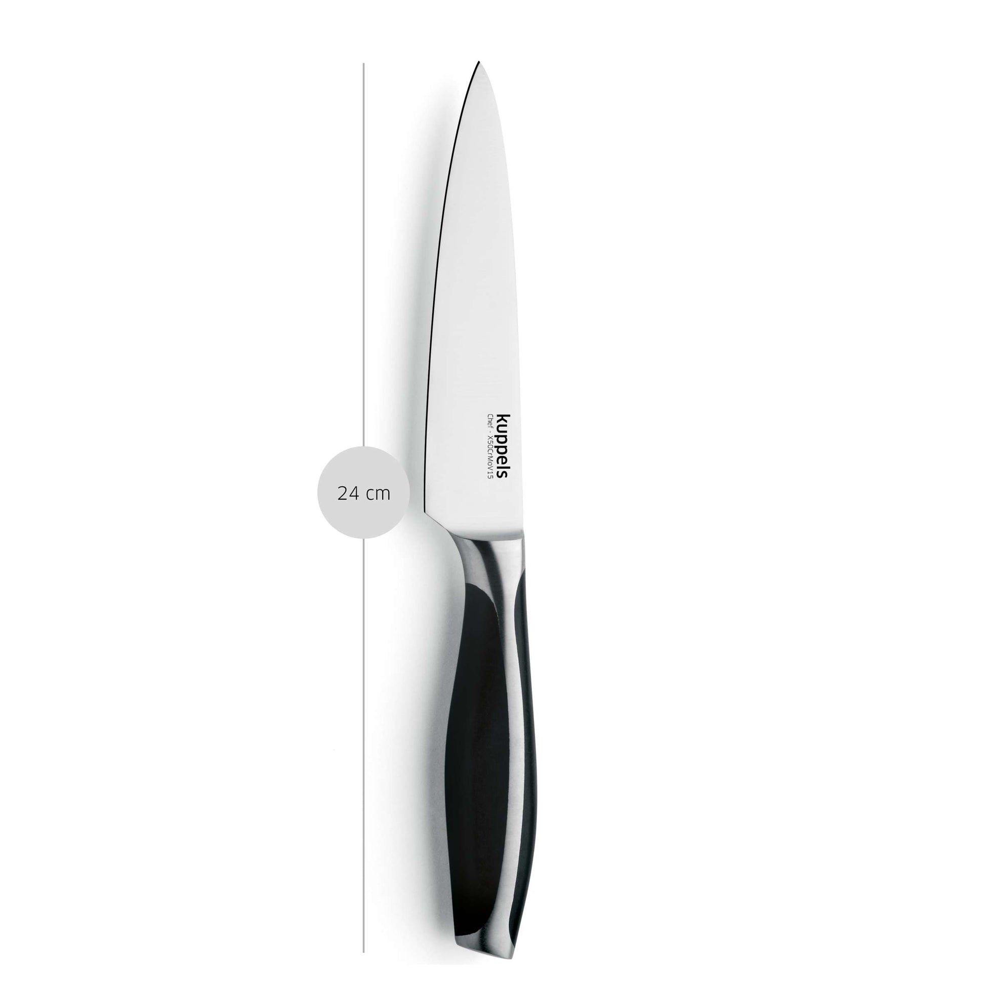 A professional kitchen knife with attention to detail – the excellent sharpness combined with the perfectly balanced handle design makes this knife particularly comfortable to hold. This allows all cutting tasks to be performed with ease and precision. The continuous tang from tip to end of the handle offers maximum control and balance. The high-quality blade steel gives the blade its excellent sharpness and edge retention. The elegant handle feels pleasantly heavy in the hand and ensures comfortable cutting and precise results. With the CHEF kitchen knife from Kuppels, you'll slice your ingredients like a pro.