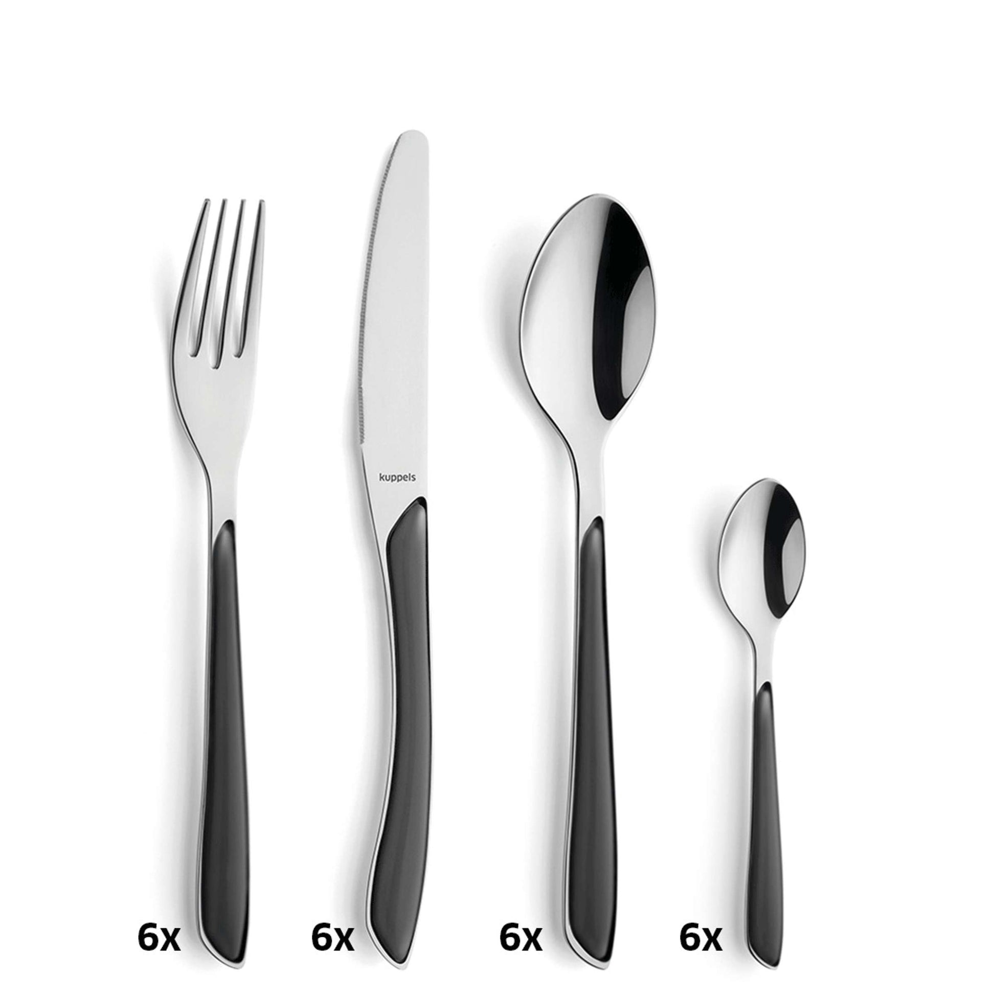 - Contents: 6 coffee spoons, 6 dinner forks, 6 dinner spoons, 6 dinner knives