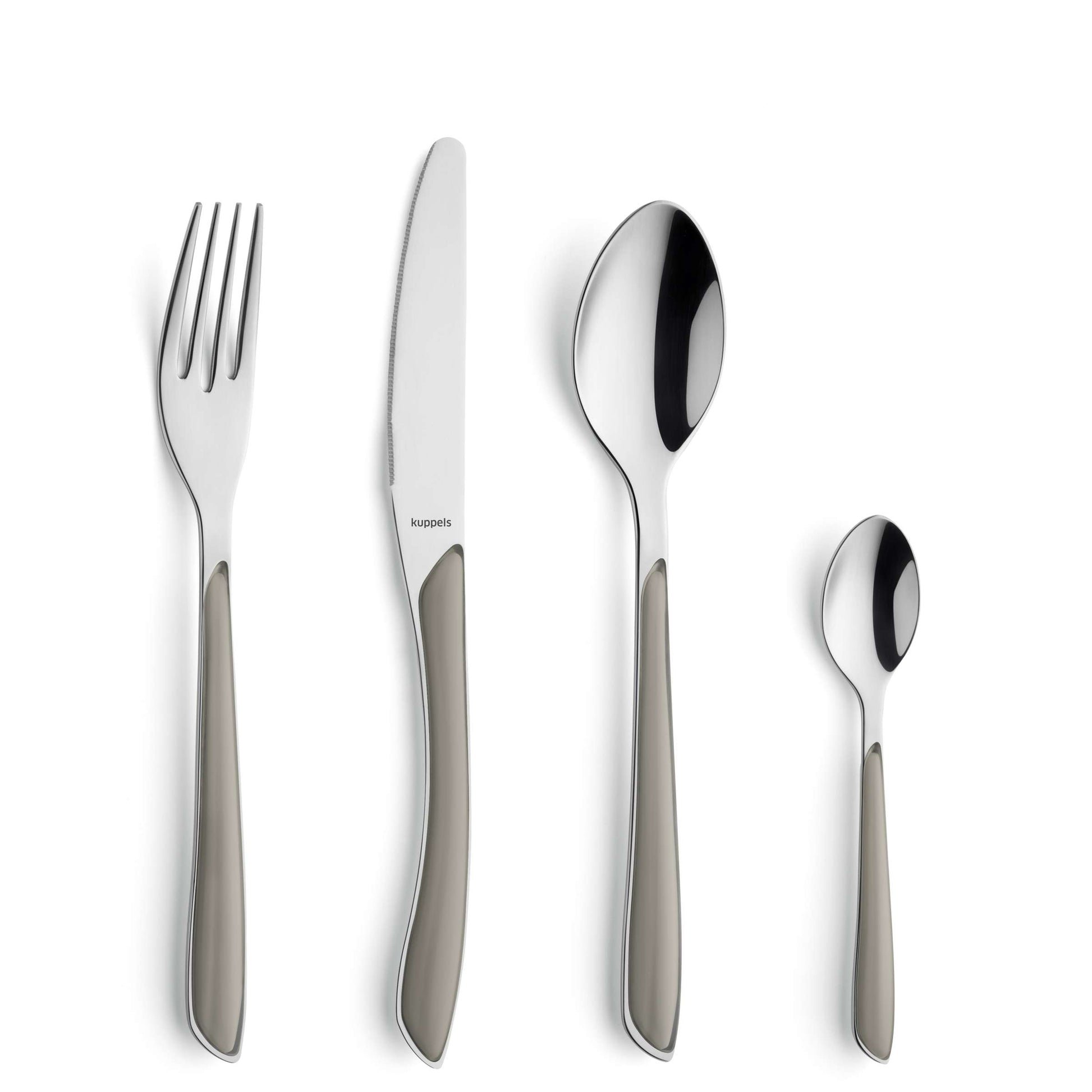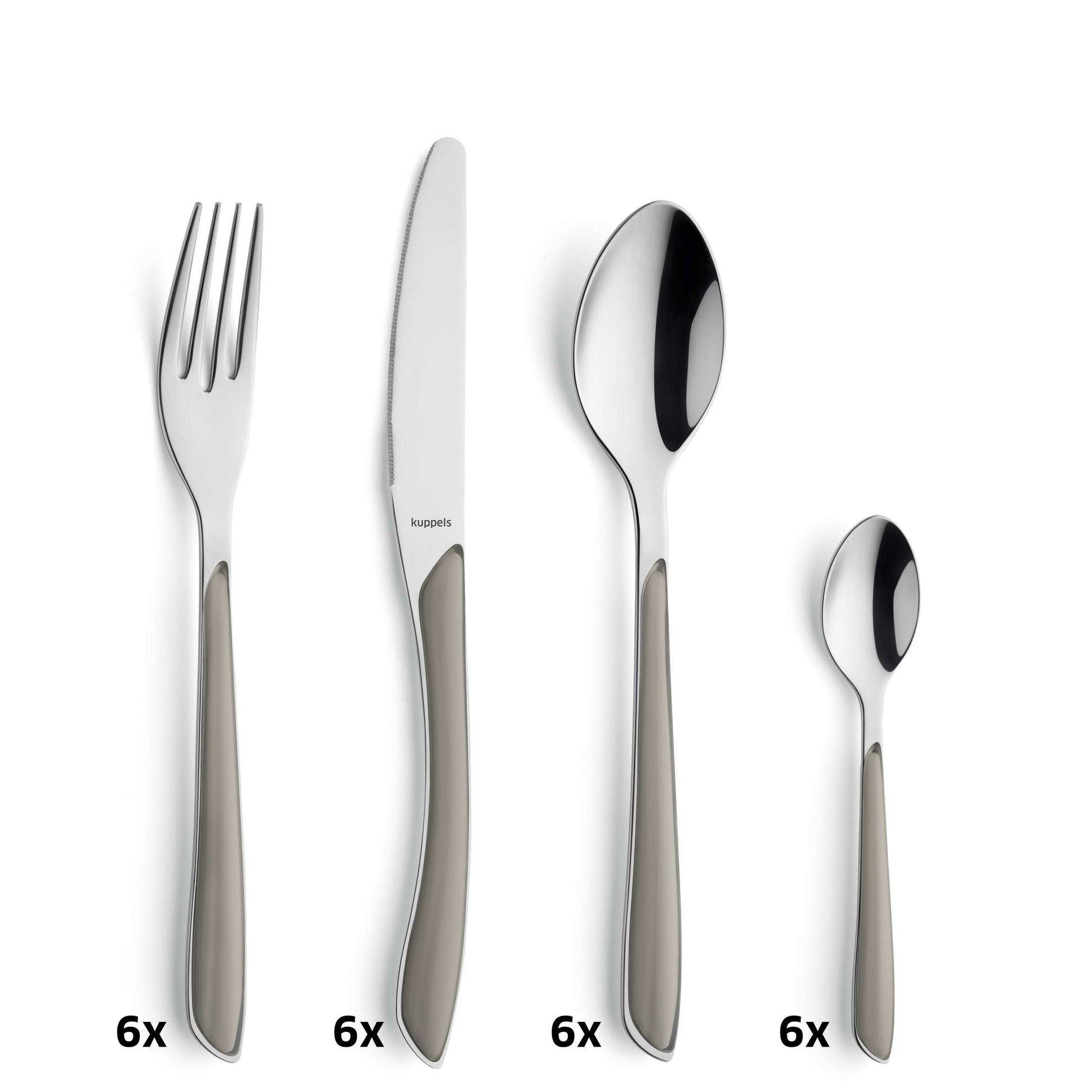 The vibrant colors of the PRISMA 24-piece taupe cutlery set add color and style to your table setting. The elegantly shaped handles add cheerful accents and can be wonderfully combined with your tableware or table decorations.