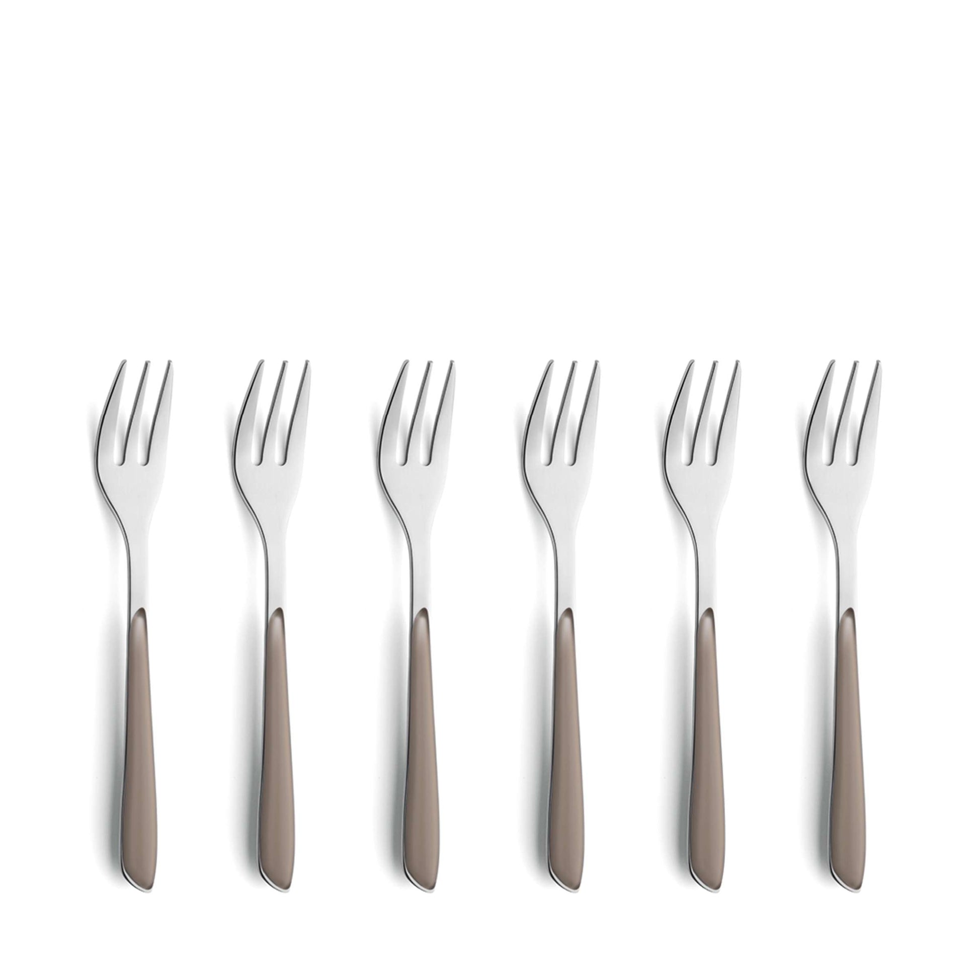 The PRISMA 6-piece cocoa cake fork set brings warm tones to your table. These stainless steel forks with transparent cocoa handles are perfect for cakes, tarts, and desserts.