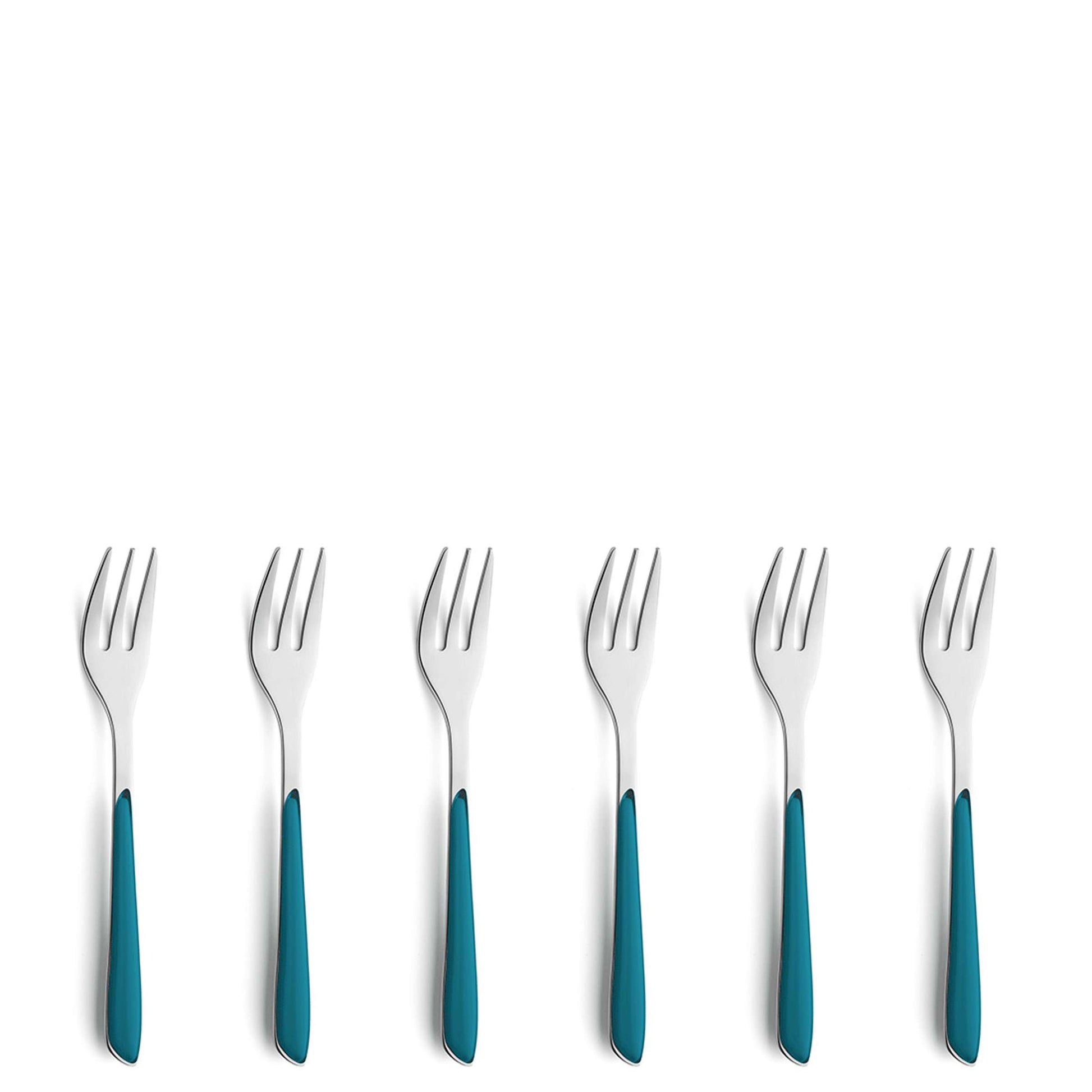 The PRISMA 6-piece petrol cake fork set brings vibrant color to any table setting. These stainless steel forks with transparent petrol handles are ideal for cakes and desserts.