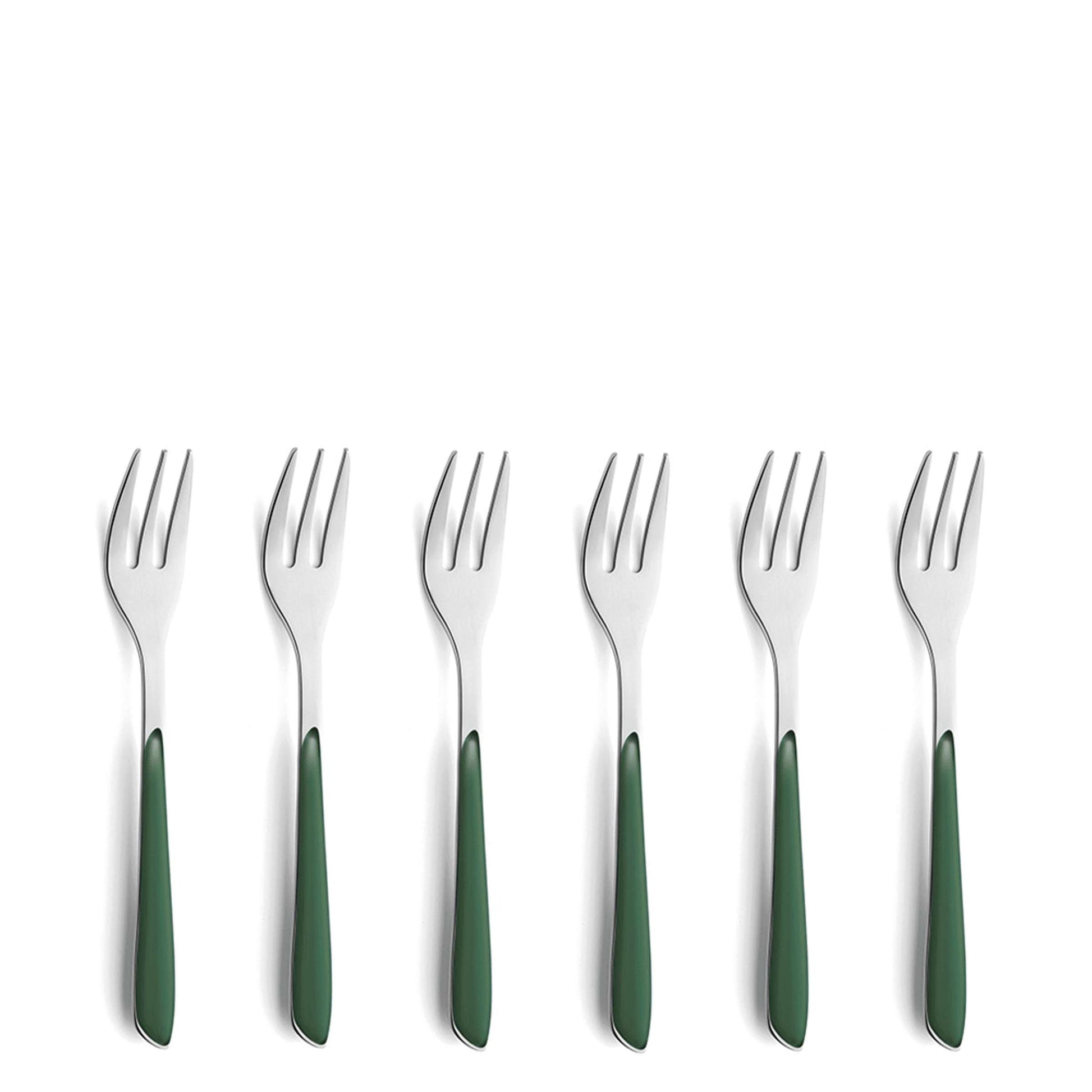The PRISMA 6-piece fir green cake fork set adds vibrant color accents to your table. These high-quality stainless steel forks with transparent fir green handles are comfortable to hold and ideal for cakes, desserts, and pastries.