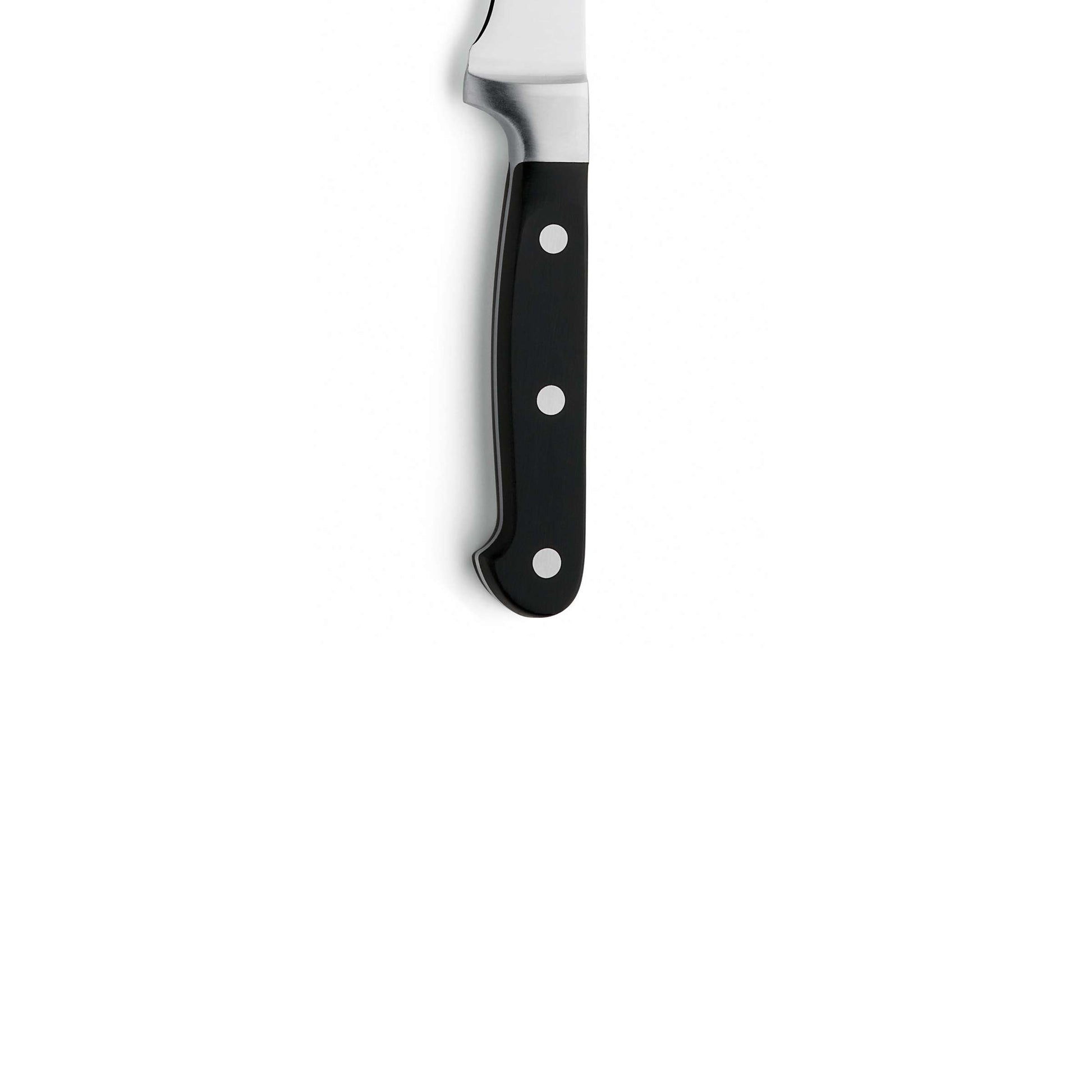 Effective, fatigue-free cutting thanks to the high-quality, sharp, and robust knife blade. The continuous tang from tip to end of the handle allows for maximum control and balance. The classic triple-riveted, ergonomic handle, made of robust plastic, and the chrome-vanadium blade steel (X30Cr14) ensure safe, comfortable cutting and a long edge retention.