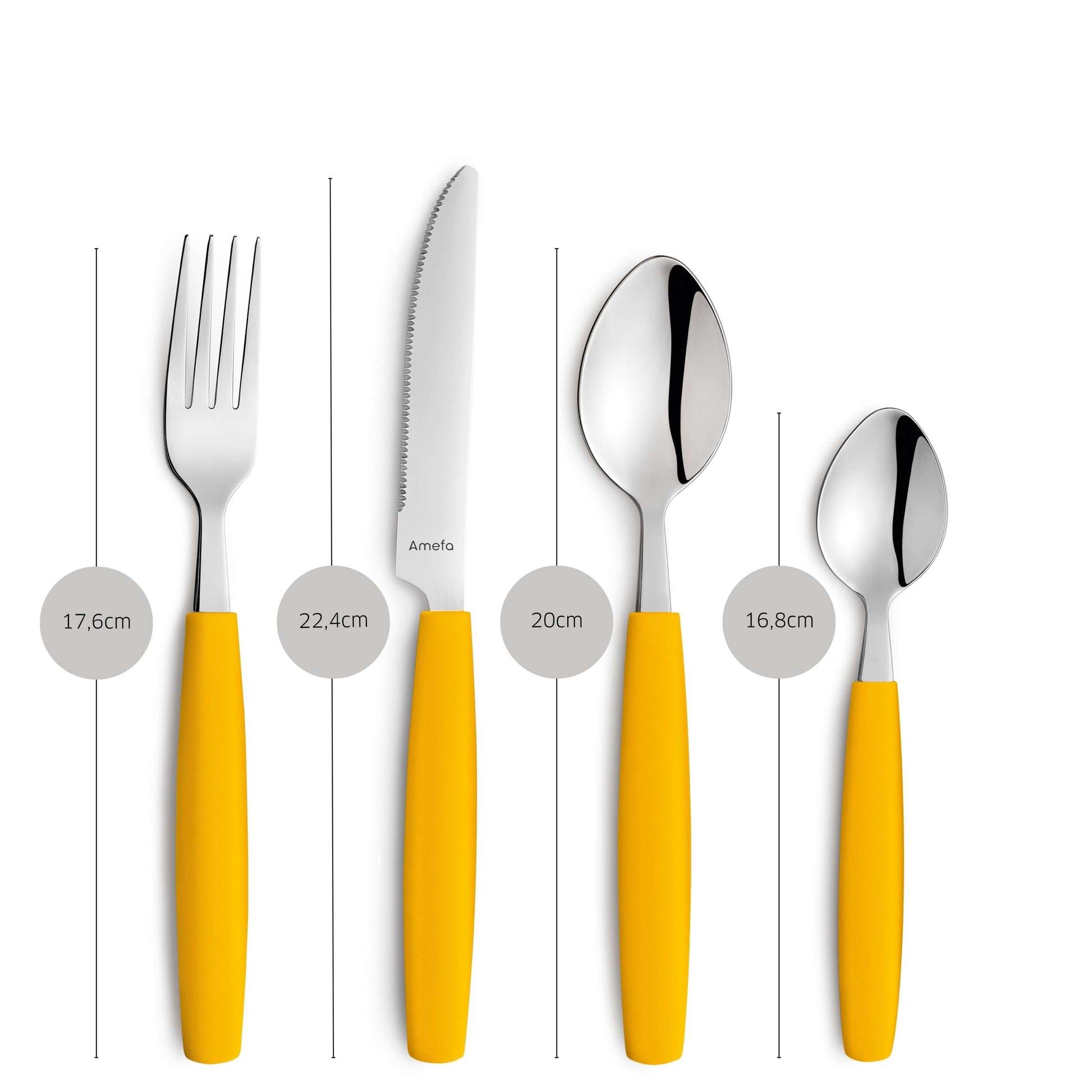 The Valoa cutlery set in summer yellow brings a sunny freshness to your dining table. The colored plastic handles radiate a warm yellow tone, making this cutlery a cheerful companion for breakfast, lunch, or dinner. Ideal for those who want to add color to their everyday routine without sacrificing functionality. Made of stainless steel and featuring robust plastic handles, the cutlery is easy to handle and dishwasher-safe. Particularly popular as family cutlery or shared flatware, Valoa in summer yellow combines good cheer with everyday practicality.