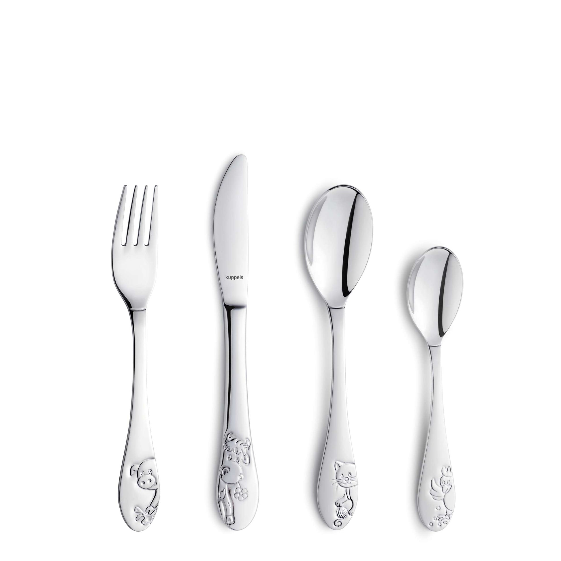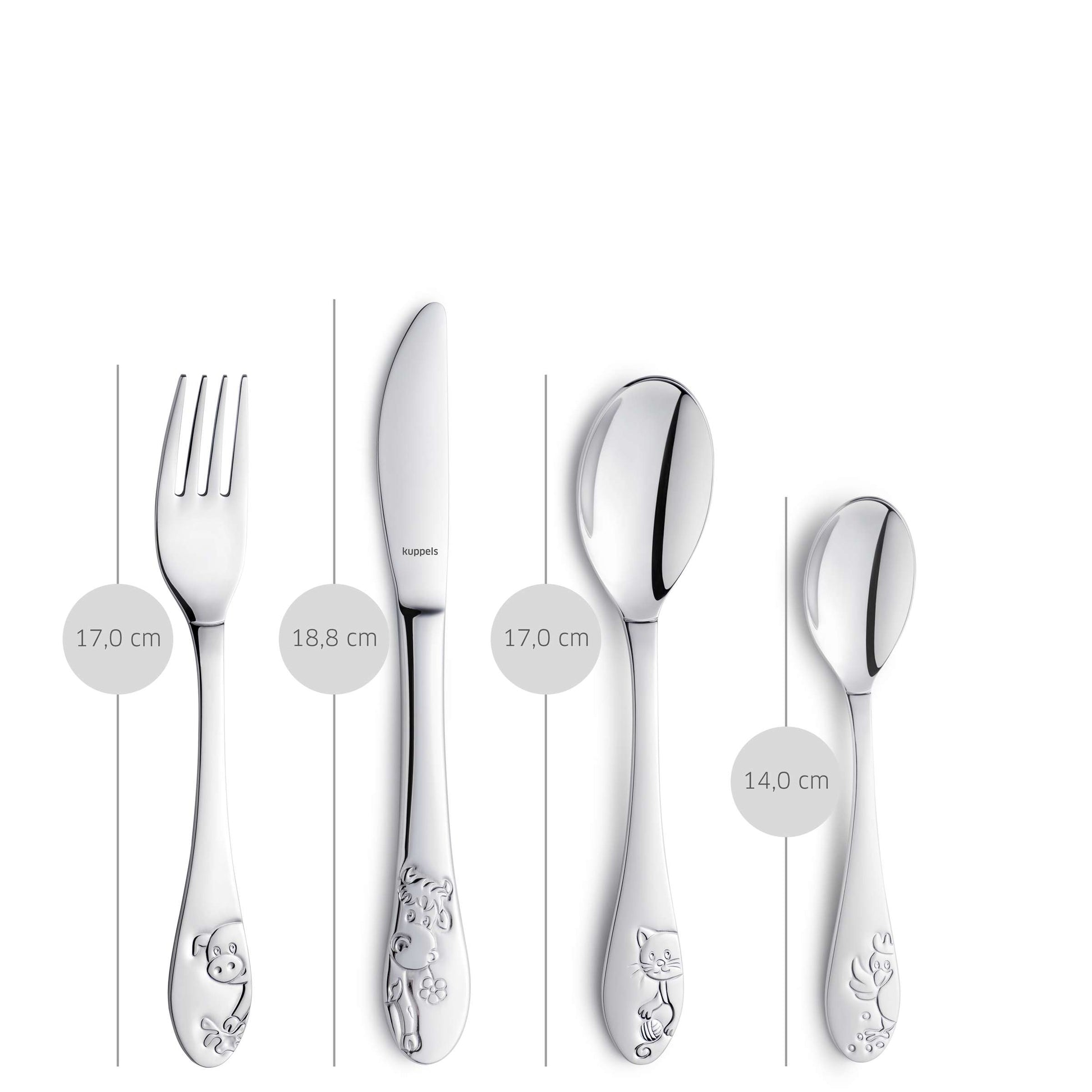 Inhalt: 1 Kindergabel, 1 Kinderlöffel, 1 Kindermesser, 1 Kinderteelöffel
