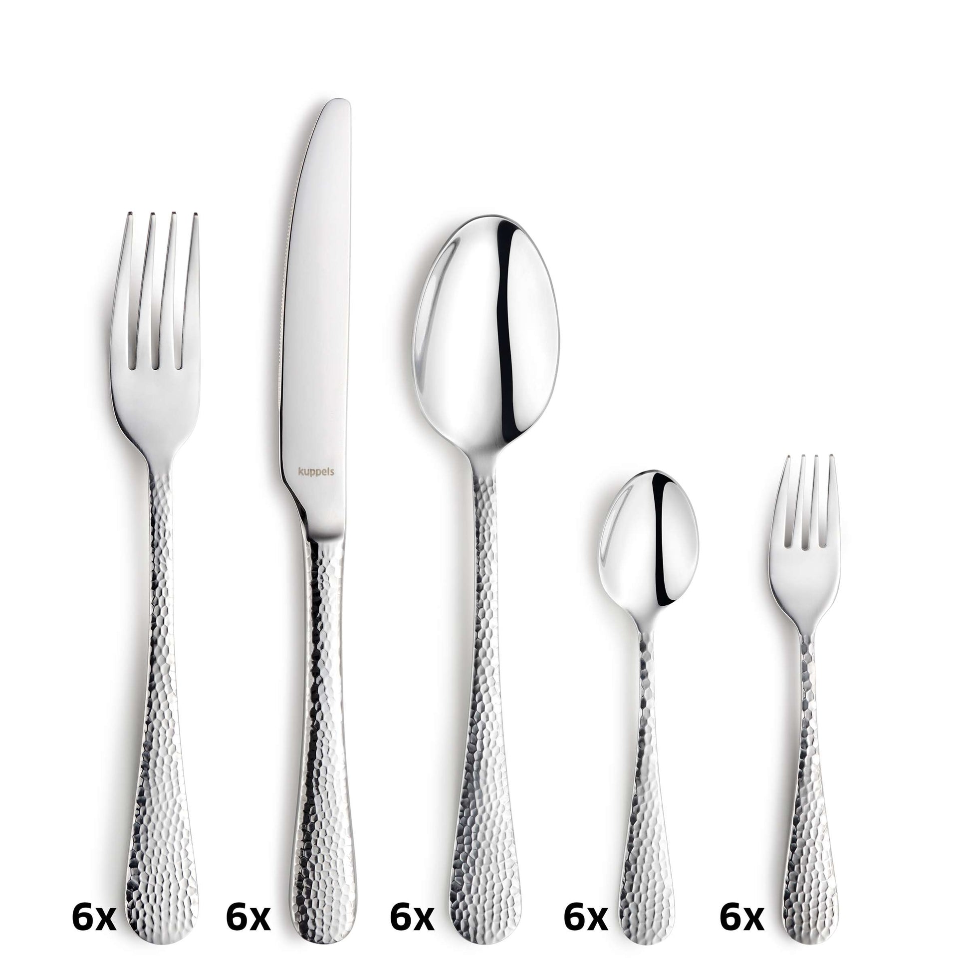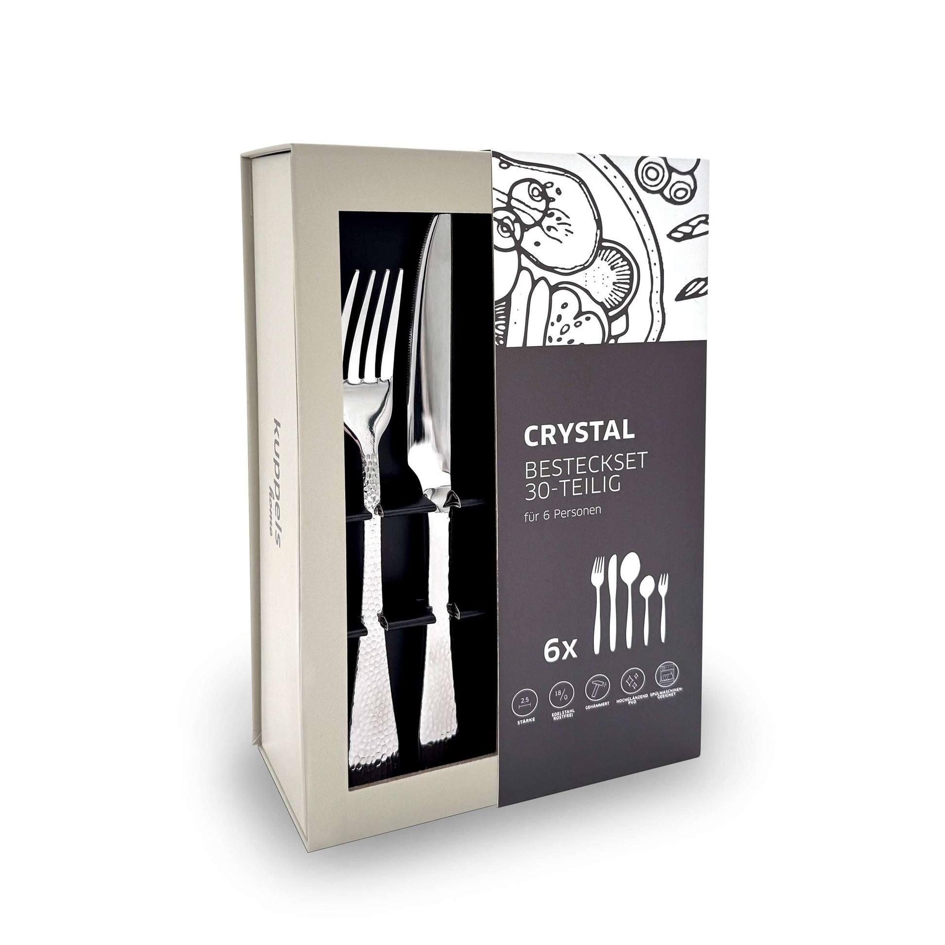 Das CRYSTAL Besteckset 30-teilig vereint zeitloses Design mit einer markanten, gehämmerten Oberfläche, die sogenannte Hammerschlag-Struktur und eine polierte, pflegeleichte Oberfläche.