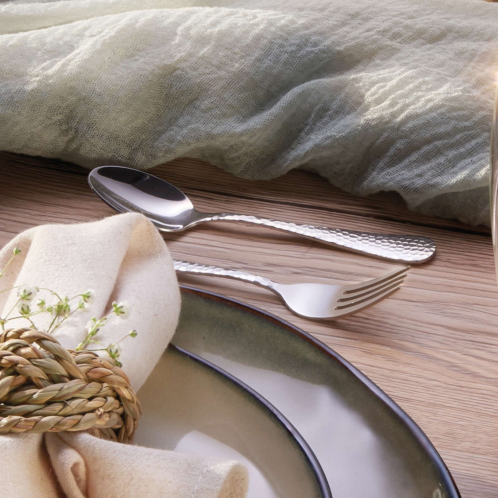 - Modernes Design Besteck – abgerundete Griffe & gehämmerte Oberfläche mit edlem Lichtspiel