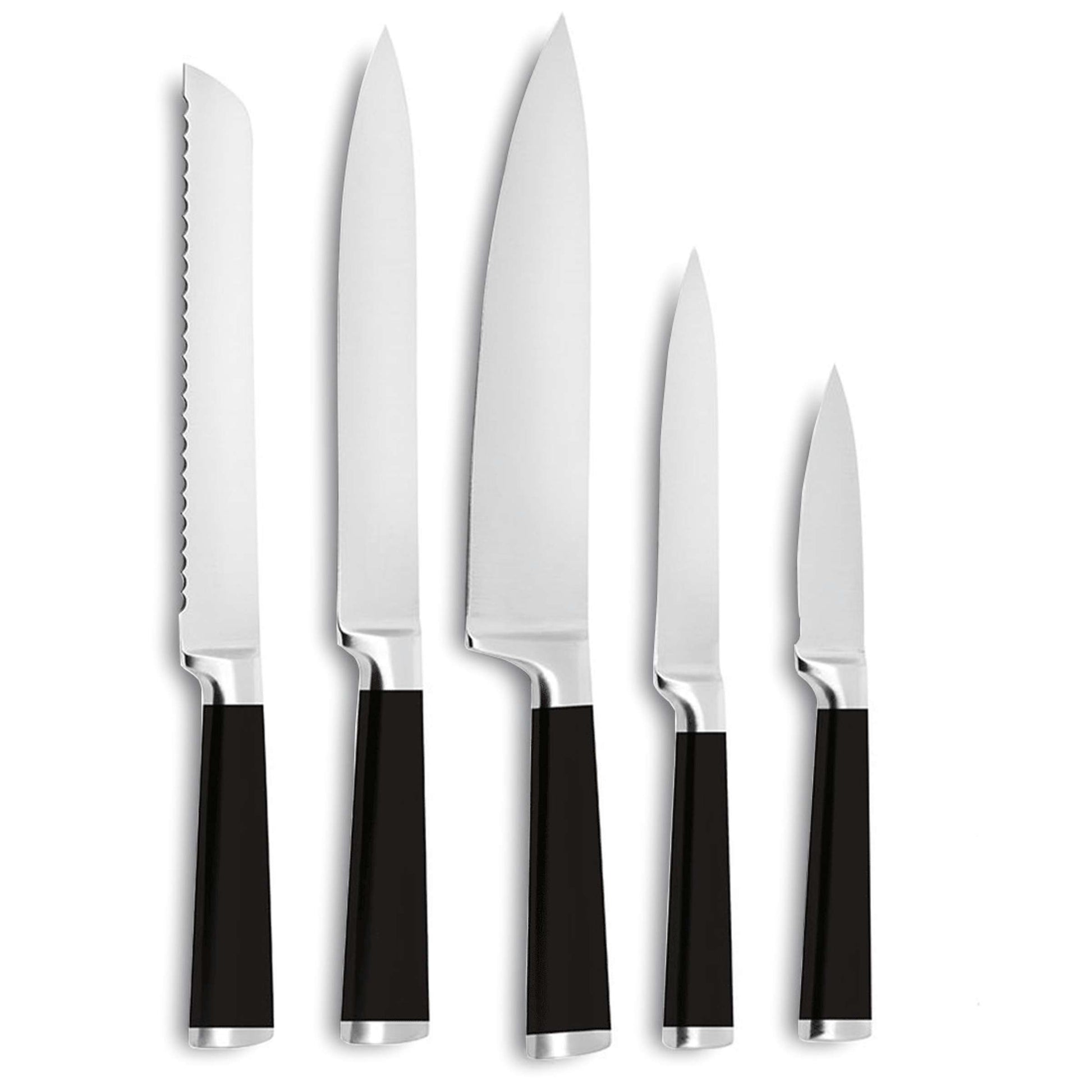 Inhalt: 5-teilig: 1 Allzweckmesser, 1 Brotmesser, 1 Kochmesser, 1 Messerblock, 1 Spickmesser, 1 Tranchiermesser